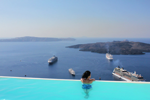 With an area of about 28 mi2 (73 km2) — just slightly bigger than half of San Francisco — Santorini is a remnant of a volcanic eruption that destroyed what used to be a single island, in the process creating the present-day caldera. Steep, high cliffs (rising up to 980 feet or 300 meters) surround a semi-rectangular central lagoon measuring roughly 7.5 by 4.3 miles (12 by 7 km) on three sides, with the main island gradually sloping downward to the Aegean Sea. Its capital, Fira, perches atop of the cliff looking down on the bay, where cruise ships and smaller boats are now a common sight. (Not a particularly unpleasant setup, especially when you're soaking comfortably in a pool, watching the Greek day go by.)