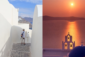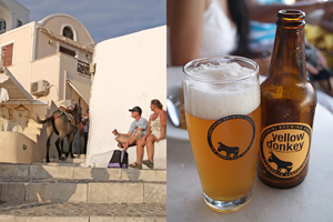 There's no place anywhere I've been quite like it — stark rock cliffs, and postcard-perfect houses and buildings on endless bluffs, the deep, blue Aegean Sea, and fiery sunsets, cobblestone streets, and long, winding steps, quaint shops, and donkey carts, even several beer labels named after a donkey — this must be Santorini Splendor.
