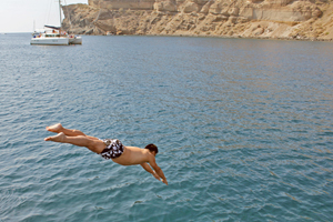 Sailing around the Agean Sea and the caldera on a yacht — it goes without saying — remains to be the highlight of any visit to Santorini. Short of hiring your own boat and captain, you can pick any of many caldera cruise tour packages available April through November. Make sure to book one that caters to only a handful of passengers, and includes a full lunch (seafood, I'd guess) in the saloon area below deck, and an open bar elsewhere, if you insist. Most yacht cruises circle the bay to show the remarkable sections of the bay and caldera, allow interested passengers to visit the volcanic island and linger for a bit in its hot springs, and encourage everyone else to soak up the sun and dive into the deep, blue Aegean Sea.